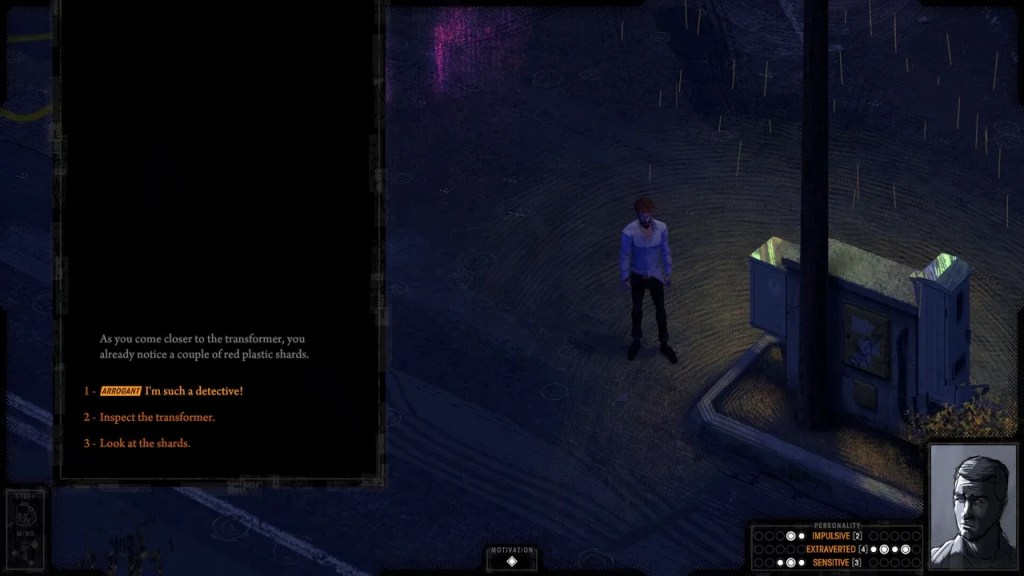 Cette amnésie, tout comme la mise en scène introspective, rappelle évidemment Disco Elysium. Le clin d’œil devient encore plus évident lorsque Harrow se regarde dans le miroir de la salle de bain et éprouve de la difficulté à reconnaître son propre visage.