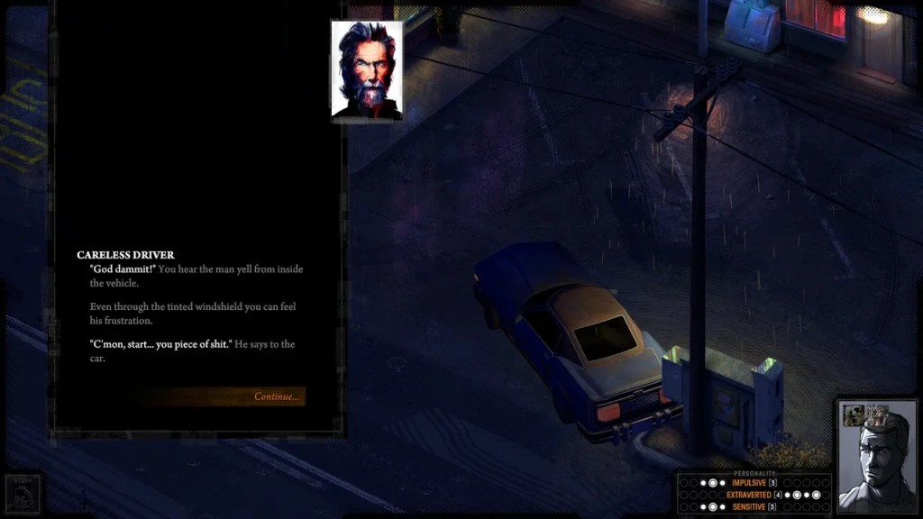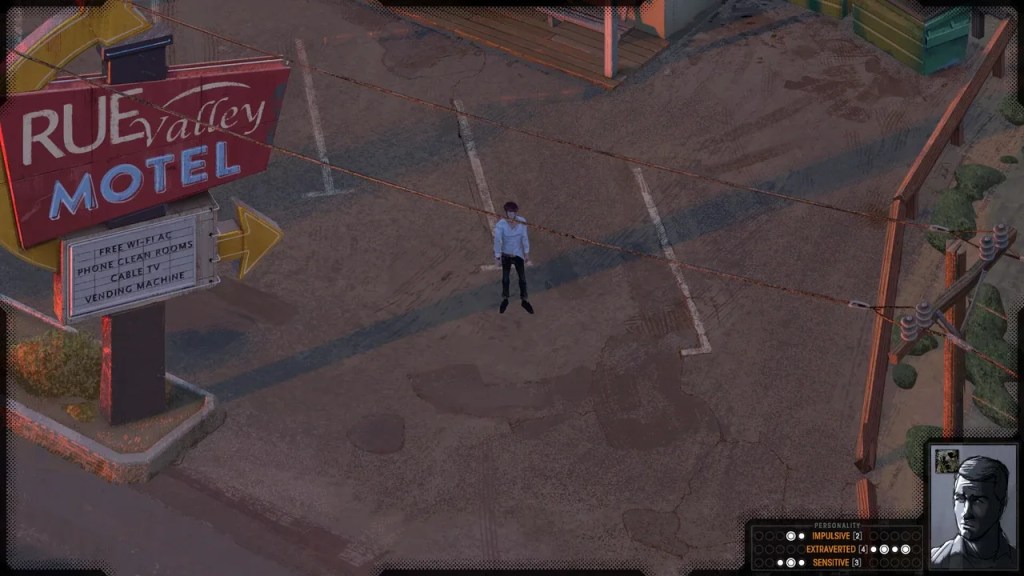 Sur Steam, Rue Valley est classé, entre autres, comme jeu de rôle, probablement par analogie à Disco Elysium. En réalité, il s’agit plutôt d’un jeu d’aventure narrative, riche en dialogues mais sans système de niveaux ou d’expérience. Les caractéristiques du personnage influencent bien les réponses possibles, mais pas toujours l’issue de l’histoire. Souvent, on sent que les choix teintent la conversation, mais ne changent pas fondamentalement le scénario. J’ai eu l’impression que peu importe ce qu’on dit, on finit par atteindre le même objectif. C’est un peu dommage, car le système semblait promettre des ramifications plus profondes.