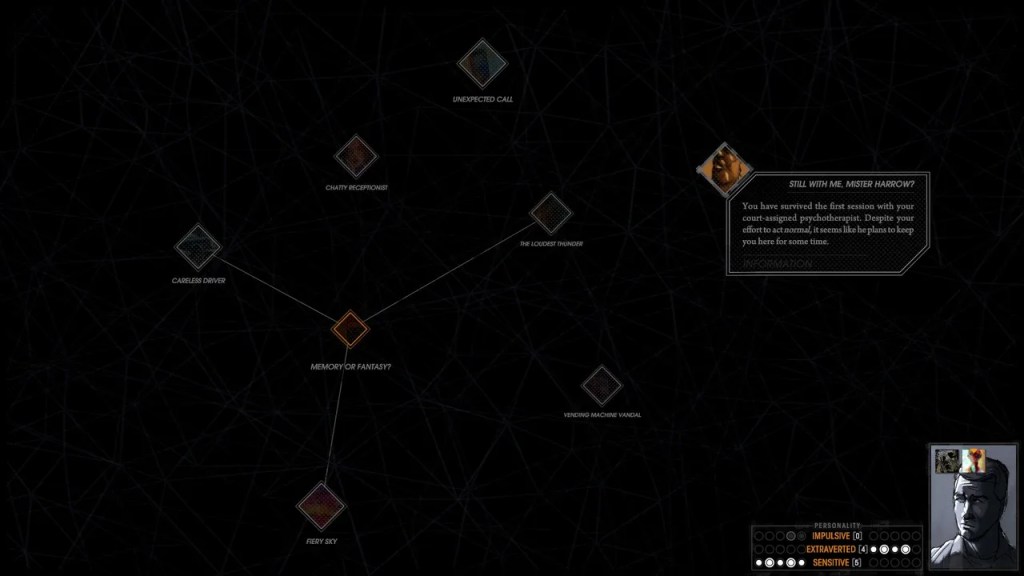 Le joueur prend le contrôle de Harrow, assis dans le bureau d’un psychiatre. La séance touche à sa fin. Harrow ne semble pas savoir pourquoi il est là, il a oublié la raison de sa venue.