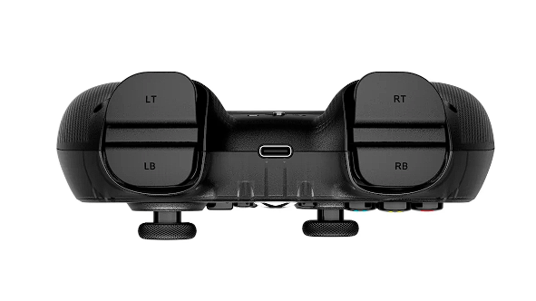 À l’arrière, se trouve un interrupteur permettant de basculer entre le mode Xbox et mobile, tandis que sur le dessus prennent place les gâchettes LB/LT et RB/RT.