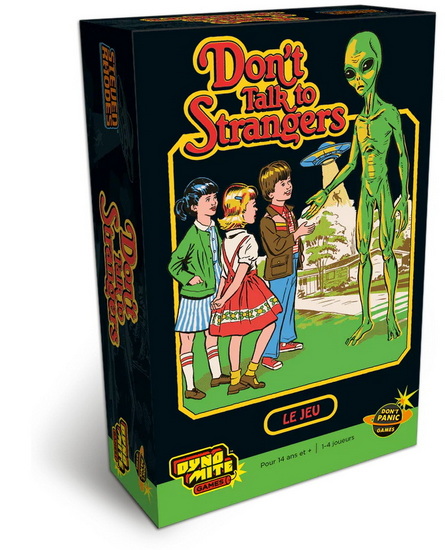 Don’t talk to strangers est un mini jeu de société créé en 2021 par Ben Stoll et distribué, en français, par Pierre Belvedère en 2025. Conçu pour 1 à 4 joueurs, âgés de 14 ans et plus, d’une durée de 15 à 20 minutes, il s’agit d’un jeu de cartes d’actions. Dans la boîte : un livre de règles, 100 cartes, 10 jetons Alien, 1 plateau de jeu recto verso (Quartier A et B), 1 jeton Soucoupe Volante et 40 jetons Enfant (4 couleurs/10 par joueur).