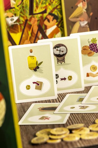 Les cartes améliorations peuvent être achetées avec de l’argent selon les mêmes règles que les cartes de marchés. Ces cartes sont souvent des versions plus efficaces des actions de base (récolter 2 fois, possibilité d’échanger sur 2 marchés plutôt qu’un, meilleur ratio lors du pressage des olives, plus d’argent, etc.)