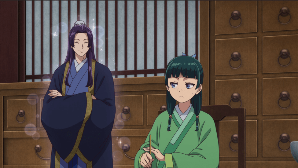 Notre première protagoniste, Maomao, se démarque par sa grande intelligence, sa connaissance des poisons et médicaments et sa grande capacité d’analyse. Ces talents font en sorte que plusieurs membres du palais impérial la recrute pour les aider avec leurs problèmes. En revanche, elle semble très distante et froide avec les gens autour d’elle et n’a aucune compréhension des normes sociales, mettant les gens autour d’elle mal à l’aise ou confus par ses actions. Elle est aussi régulièrement comparée à un chat à cause de façon d’agir et l’anime va parfois la représenter avec des oreilles et une queue de chat quand ses émotions virent hors de contrôle. C’est aussi une personne qui semble hésitante par moment à demander ce qu’elle veut et qui est très consciente de son statut de paysanne, évitant de poser trop de questions ou d’explorer certaines pistes que son esprit analytique remarque, sachant qu’en savoir trop… c’est risquer de finir exécutée.