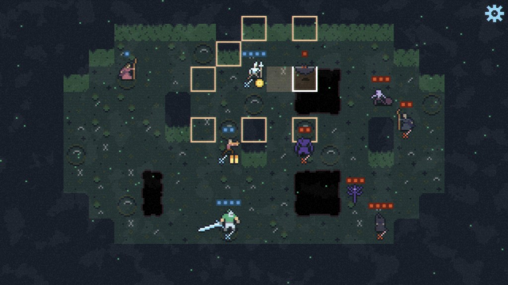 Vous commencez par créer votre guilde avec un choix minimum : soit un archer, un mage ou un chevalier. Une combinaison de deux de ces options vous est imposée, car j’aurais aimé pouvoir choisir mon duo, mais c’est impossible. Le jeu se déroule dans cinq biomes différents avec des donjons créés aléatoirement. Vous terminez un niveau et vous avez parfois le choix de deux directions différentes, ce qui vous pousse à faire des choix : utiliser l’XP gagné pour améliorer vos unités, promouvoir un chevalier, engager de nouvelles unités ou parfois avoir des conversations qui vous aideront ou vous nuiront dans votre aventure. Certaines unités ont une limitation de mouvement, comme l’archer qui se déplace en diagonale ou le mage qui peut bouger d’une case à la fois, ce qui peut rendre difficile le développement de la meilleure stratégie possible. Faites attention parfois à ne pas attaquer vos propres unités avec votre mage… ce qui m’est arrivé à plusieurs reprises.