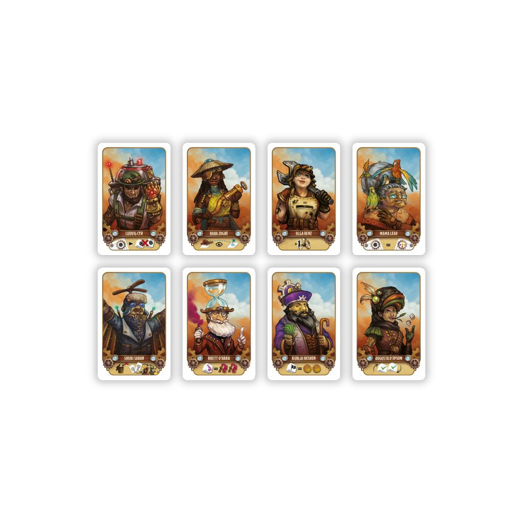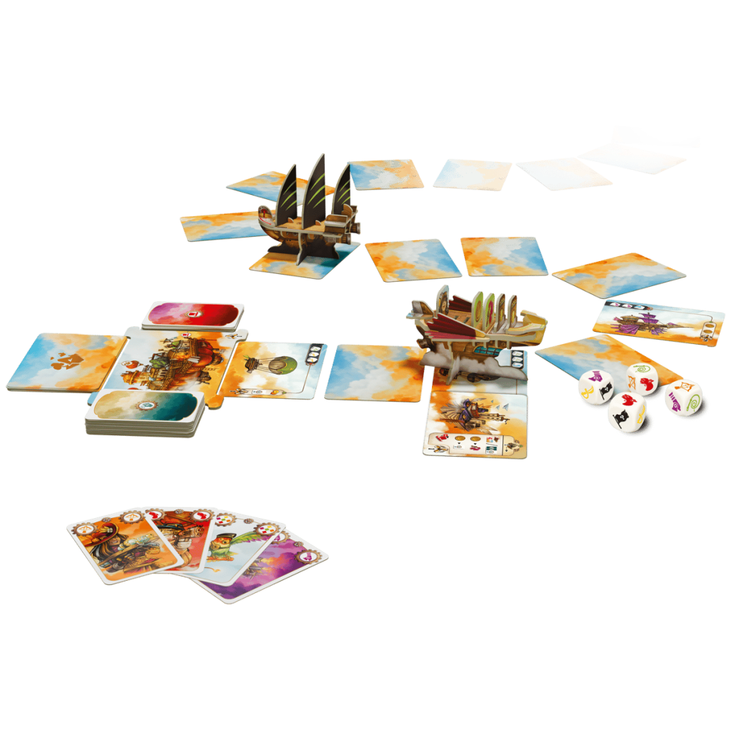 Pour commencer, les joueurs devront placer la cité de départ au centre de la table. Ensuite, aux endroits indiqués sur la cité, les joueurs devront venir placer les cartes étapes, les cartes équipements et les cartes équipages. Par la suite, ils devront prendre une carte embuscade de départ de façon aléatoire et la placer au départ du chemin de leur aventure. Les aventuriers peuvent par la suite mélanger les cartes embuscade et les placer afin de faire un chemin. Le vaisseau pirate est placé sur la douzième carte embuscade du chemin et la tuile repaire à la fin. Les joueurs peuvent poursuivre la mise en place en choisissant la difficulté du voyage. Si la difficulté rapide est choisie, simplement prendre la carte pirate nommée Artorius Fénimore et la placer au repaire. Si la difficulté normale est choisie, prendre l’une des cartes nommées Noa De Bobadilla et la mettre au repaire. Il faudra aussi piocher trois cartes assaut et les mettre face cachée près du repaire. Si la difficulté experte est choisie, faire les mêmes étapes que pour le mode normal mais avec la carte nommée Gardenzio Gambi. Il faut maintenant préparer l’aéronef. Pour ce faire, il faudra placer de façon aléatoire l’un des 3 ponts supérieurs. Ensuite, les joueurs insèrent sans regarder la partie inférieure du jeton un nombre de jetons générateur selon le pont supérieur obtenu. Les aventuriers doivent par la suite mettre un jeton fumigène sur leur bateau et piocher une carte équipage pour obtenir un personnage de départ qui les aidera. Les joueurs reçoivent 4 cartes et on en place 4 au centre de la table qui seront partagées de façon équitable et à tour de rôle. Les jetons et les dés sont placés pour un accès rapide de tous les joueurs. Finalement, le capitaine est choisi au hasard.