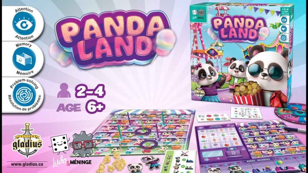 Panda Land est un jeu pour 2 à 4 joueurs de 6 ans et plus. Édité chez Gladius, le jeu fait partie de la collection Ludo et Méninge qui produit des jeux de société pour enfants dont le but est d’amuser dans l’apprentissage. Dans Panda Land, l’objectif est de réussir des activités de carnaval dans le but de ramasser des morceaux de popcorn.