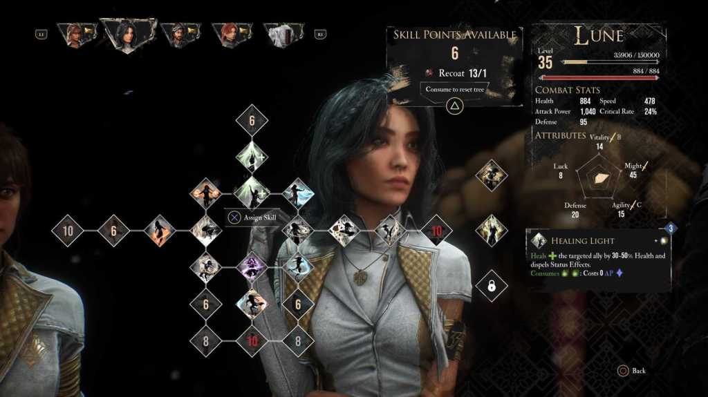 Lune fera office de soutien principal. La plupart de ses compétences génèrent des Taches de Lumière, surtout Healing Light. Conservez-la principalement en tant que soigneuse afin d’accumuler ces Taches. Une fois la jauge remplie, vous pourrez déclencher Mayhem, une attaque capable d’infliger des dégâts dévastateurs si elle est bien préparée.