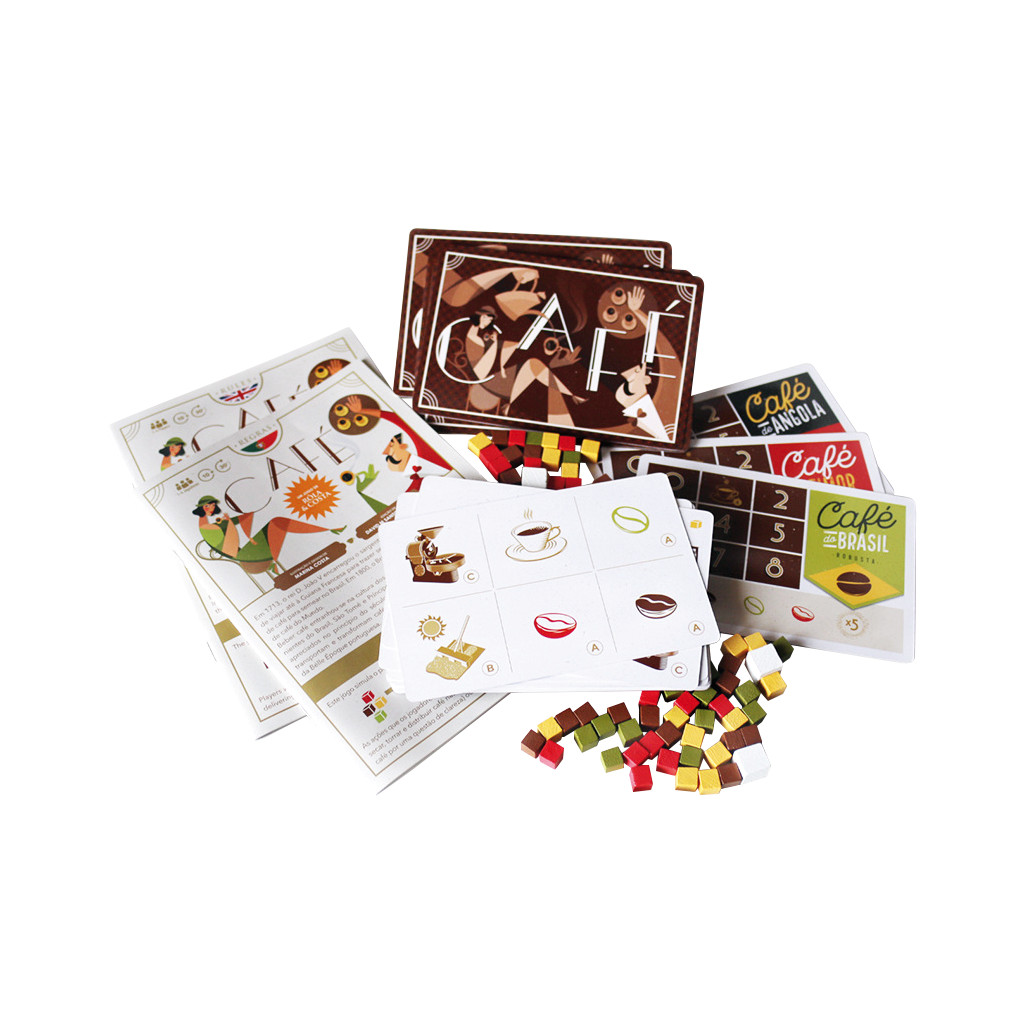 Café est le premier jeu de la série « 5 Quinas » imaginé par les auteurs portugais Rôla et Costa. Pour l’instant, deux autres jeux sont disponibles dans cette série (Oliva, que j’ai couvert en 2025, et Lata, sorti en 2023) qui se veut un hommage aux femmes et aux hommes qui, au cours des 200 dernières années, ont lutté pour une vie meilleure grâce à leur travail acharné et leur ingéniosité débordante. Dans Café, c’est tout le travail des artisans qui a permis de révéler le Brésil comme un joueur mondial dans la production de café en 1800. Faites progresser votre entreprise en passant toutes les étapes de la récolte du café à la vente.