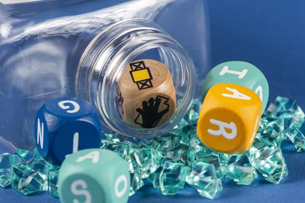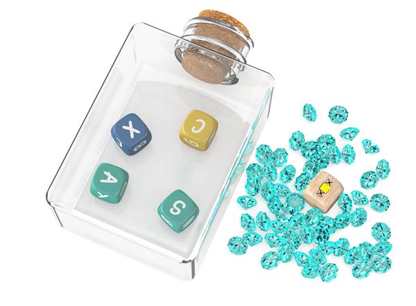 Le jeu comprend quatre dés avec des lettres sur les faces, un dé de règle spécial et 45 petits diamants qui serviront à compter les points. Le tout se présente dans une bouteille en plastique transparent, fermée avec un bouchon de liège. Les règles de base sont assez simples mais le jeu propose des variantes pour complexifier un peu l’expérience. Il propose aussi un mode facile pour jouer avec les enfants, où l’on ne joue qu’avec deux des quatre dés.