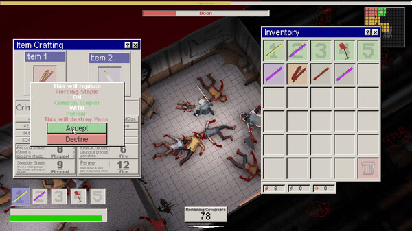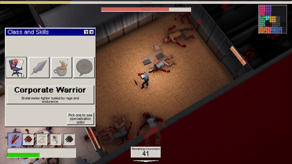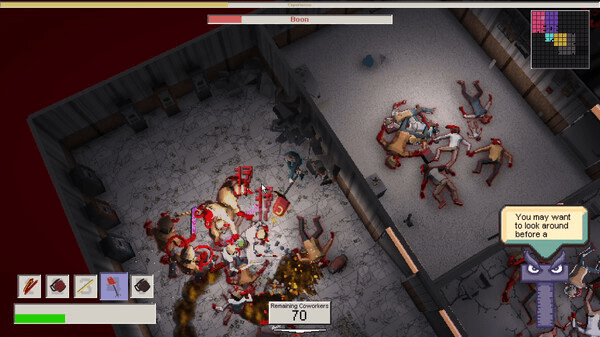 Le principe est limpide, étage après étage, il faut nettoyer les lieux à coups d’armes improvisées règle électrique, cafetière brûlante, fournitures de bureau détournées dans un gameplay twin-stick shooter classique mais efficace.