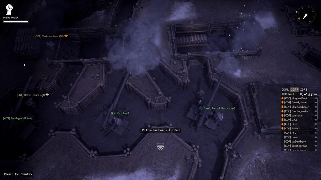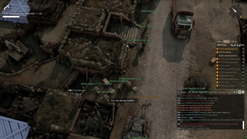 La liberté d’action des joueurs est en fait la grande force de Foxhole. Il n’y pas vraiment de classes comme dans les jeux comme Battlefield ou Call of Duty. C’est plutôt aux joueurs de choisir ce qu’ils veulent faire après être entrés en jeu. Il y a des joueurs qui ne se battent jamais sur le front mais qui restent absolument essentiels puisqu’ils se chargent de miner les ressources requises pour faire les armes. D’autres joueurs ne vont même pas se forcer à prendre une arme… préférant à la place d’aller ramasser les armes abandonnées sur le champ de bataille.