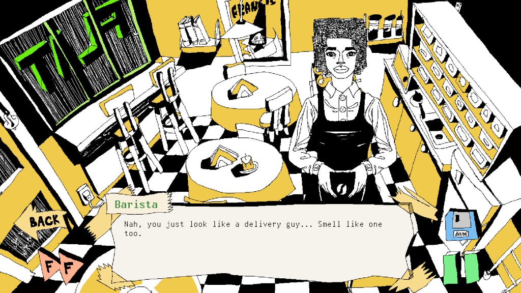 Vous êtes un jeune livreur dont le téléphone – une antiquité – vient de mourir. Avec à peine quelques pièces en poche, et aucun moyen de rentrer à la maison, vous décidez d’entrer dans un petit café, ne serait-ce que pour vous protéger de la pluie battante et du meurtrier qui, selon les rumeurs, traîne toujours dans les parages. À partir de là, le récit commence à s’embrancher. Deux choix s’offrent à vous. L’un vous permettra de continuer dans l’aventure, tandis que l’autre… eh bien disons que vous ne rentrerez pas à la maison.