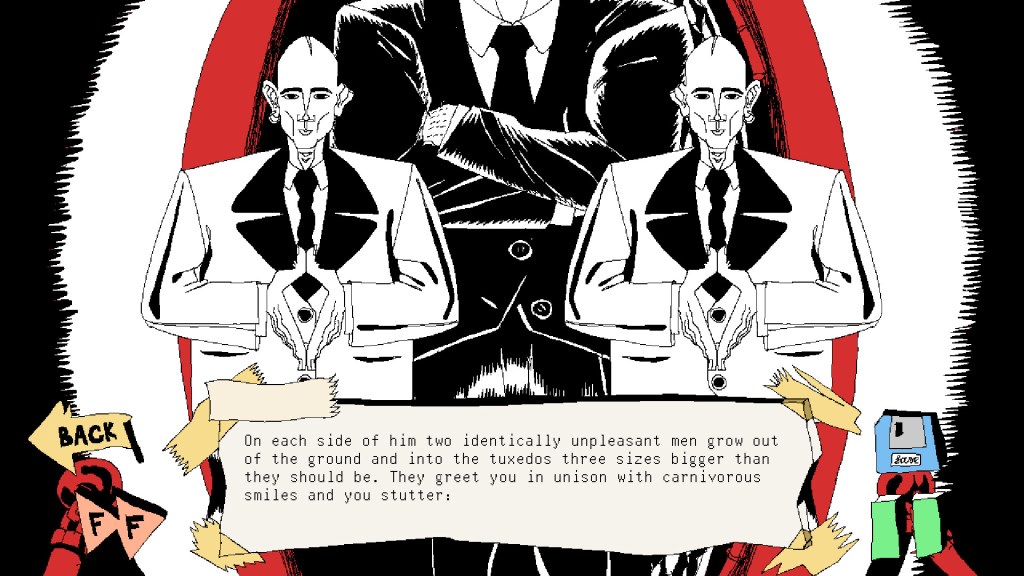 L’aspect le plus marquant de Man I Just Wanna Go Home est définitivement sa patte visuelle. Dessiné avec MS Paint, le jeu n’est pas sans ressembler un roman graphique à la Sin City. D’ailleurs, le style de dessin rappelle celui de Frank Miller (certains n’aiment pas, moi ça me plait beaucoup). Beaucoup de noir et blanc, avec une couleur très présente, presque omniprésente, et peut-être une autre, en accent. Man I Just Wanna Go Home offre un visuel comme j’en ai rarement vu dans un jeu vidéo, et ça fonctionne très bien avec le ton du jeu, très sombre en contraste.