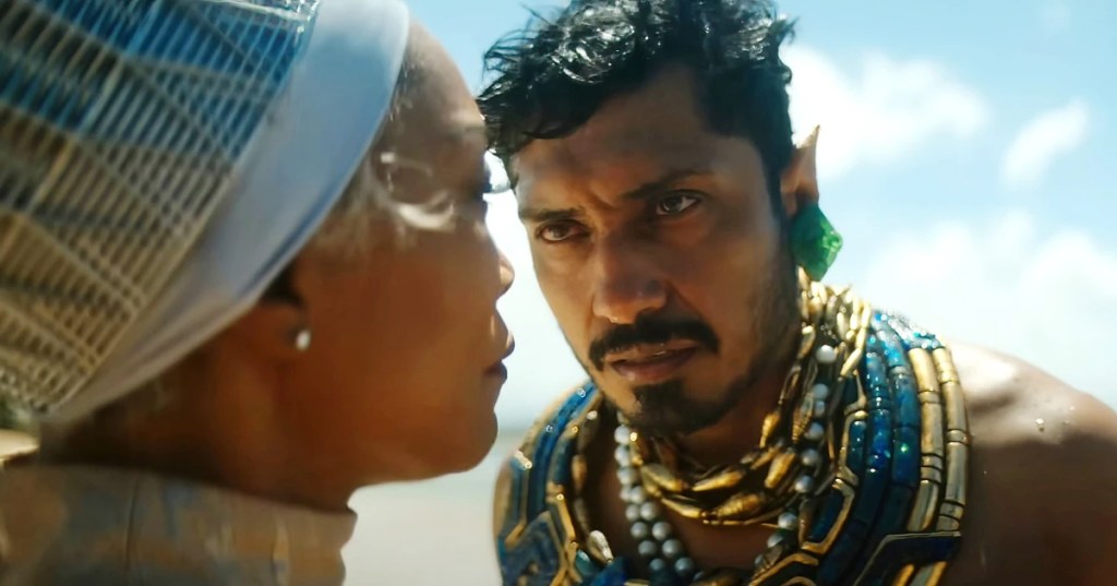 Il aurait été facile de devenir répétitif avec les nations sous-marines, surtout après Aquaman, Atlantis: The Lost Empire et Avatar: The Way of Water. Mais l’inspiration des cultures aztèques et de l’Amérique latine (notamment dans les costumes, armes et décors), combinés au futurisme du vibranium, permet à Talokan de sortir du lot. (Ses changements sont d’ailleurs propres au film, vu que dans les bédés, Namor est bien le roi de l’Atlantide, mais Ryan Coogler voulait rendre ce monde unique.) Les Talokanais ont aussi leur propre Kaméhaméh… euh, je veux dire, leur propre geste de main symbolique, semblable aux bras croisés du Wakanda.