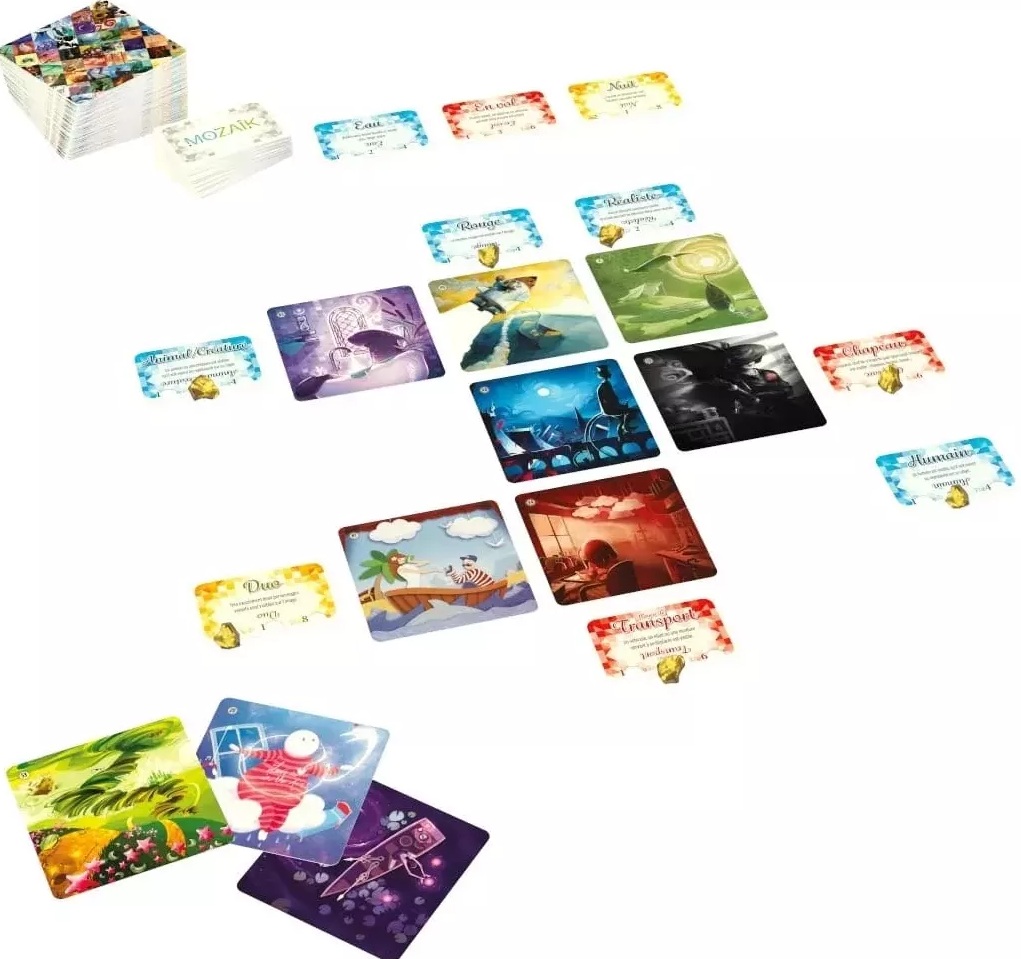 Distribué par Ilô, Mozaïk est un jeu de société de 2026 de Léo Baynaud. D’une durée d’environ 30 minutes, conçu pour 1 à 4 joueurs âgés de 10 ans +, il s’agit d’un jeu compétitif d’association d’images et de mots. Dans la boîte: 1 livre de règles, 89 cartes Image, 52 cartes Mot (20 cartes bleues de niveau facile, 18 cartes rouges de niveau moyen et 14 cartes jaunes de niveau difficile) et 36 gemmes.