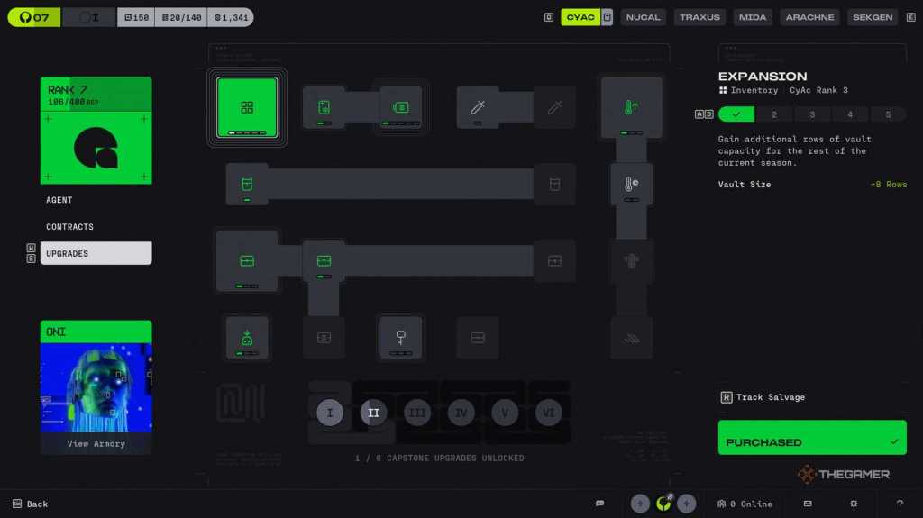 Avant de chercher à accumuler une grande quantité d’argent, il est conseillé d’augmenter la limite de votre portefeuille. Dans l’arbre de progression de la faction CyberAcme, l’amélioration Credit Limit permet d’augmenter le maximum de Credits que vous pouvez transporter.